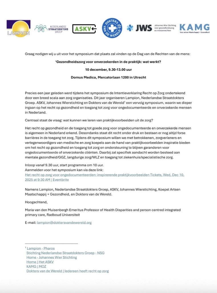 Op 10 december nodigen wij u van harte uit voor een verdiepend symposium over hoe we de toegang tot zorg voor ongedocumenteerde en onverzekerde mensen in Nederland kunnen verbeteren.